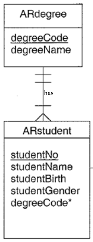 결론적으로, ARdegree의 PK는 degreeCode, ARstudent의 PK는 studentNO , FK는 degreeCode가 된다.