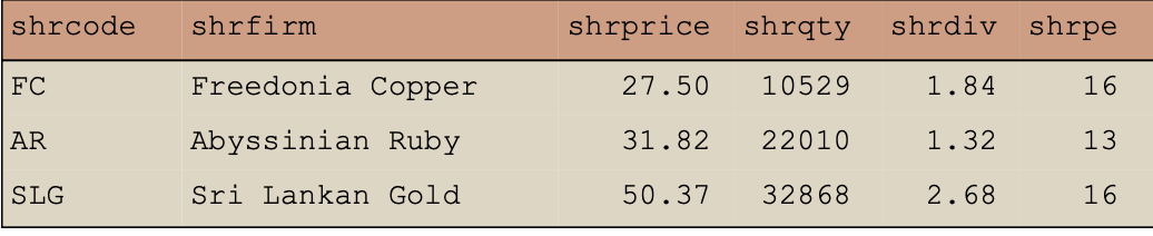 SELECT shrfirm, shrprice, shrqty, shrdiv/shrprice*100 AS yield FROM shr;