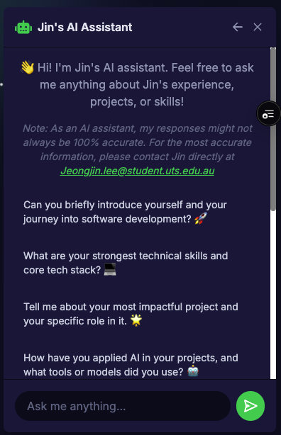 This upgrade isn’t just about showing off AI integration—it’s about giving my visitors (and potential employers) a real-time, accurate, and personalized experience when learning about my skills and projects.